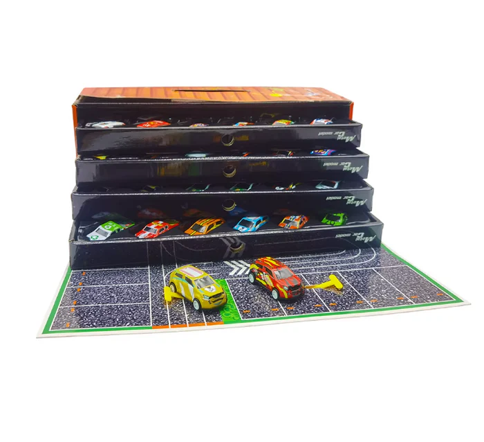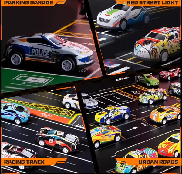 Una increíble colección de autos de carreras simulados, listos para competir, circular y estacionar.